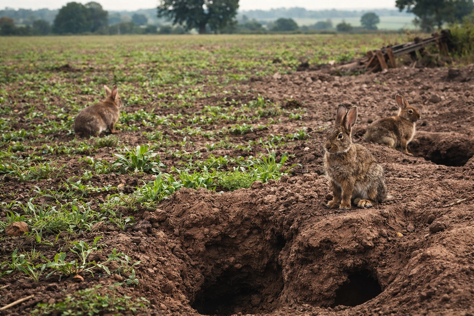 Rabbit warrens can spread across large areas of land, particularly in fields, banks and embankments. These burrow systems are often complex and difficult to manage without professional control methods.